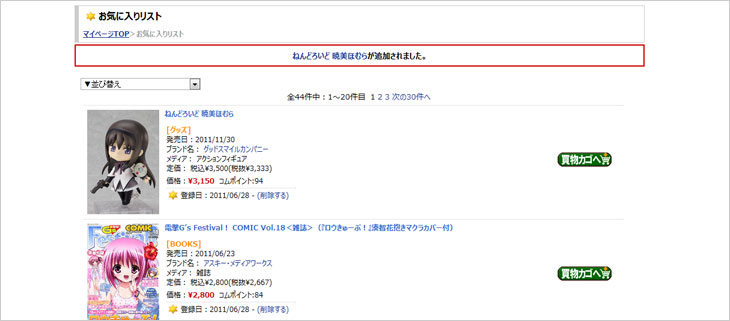 ログイン後に、お気に入りリストが表示され、追加されたメッセージが表示されます。
