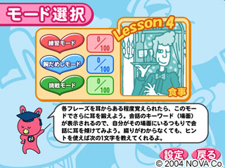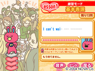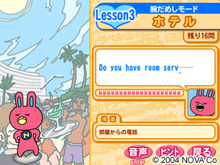 海外旅行の準備に適した、NOVAうさぎの英会話学習ソフト。英語の読み上げに集中する練習モード、腕だめしモード、挑戦モードの3つのモードを用意し、聞いて、入力して、確認するの3ステップで繰り返し練習することが可能。また、基本表現、機内空港、ホテル、食事、ショッピング、観光、交通、交通電話、トラブルの9つのシチュエーションなど全700フレーズ以上を収録。