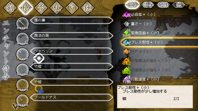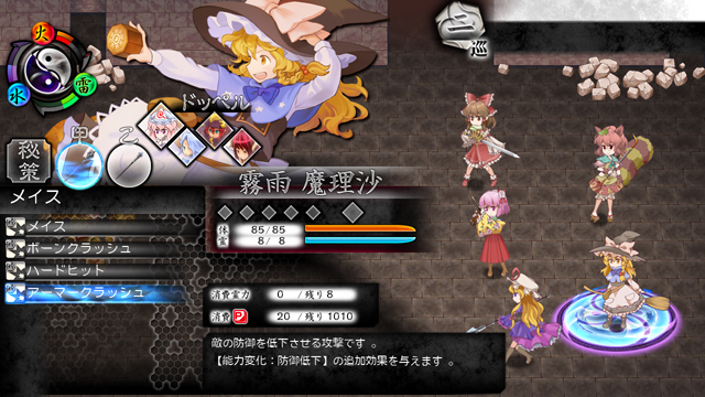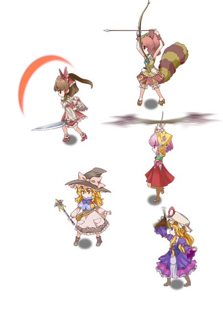 前作では剣、槍、斧、杖の4種類でしたが、東方玄夢妖譚では「弓」「銃」も追加され、6種類となりました。
